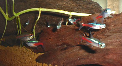 タイミングよく近くのホームセンターが熱帯魚コーナーを新設して売り出し中だったので 見に行った。 「今度は何にしようかなぁ」と見ていたのだが、水槽自体それ程大きなものではなく、生き残り組もいるのであんまり大きな魚は無理だし、 大量に群泳させることもできないということで、またまた特価:10匹150円のネオンテトラを買って帰った。 10匹といって買った袋には12匹のネオンが入っており、それを水槽にあけると忘れられていた派手さが水槽に戻った。 現在、ネオン(肥)2匹・ネオン(小)12匹・コリ(白)2匹・グロー(肥)1匹・エビ1匹。