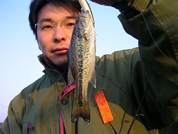 久しぶりにバス釣りに行くことになった。 行き先は琵琶湖の彦根水路。 ヤス 「明日、どこも行くつもりはなかったけど、天気がいいらしいから、どっか行く?」 柿之介 「そうやなぁ、どっかいいとこあるかな」 ヤス 「船関係は今からやったら予約がとれへんし・・・。予約が取れても伊良湖あたりは今不調やしね。バスかマスでどうよ?」 柿之介 「マス・・・、バスにしよか。せやけど、今の時期心当たりないなぁ。ちっこいのでもいい?」 ヤス 「まぁのんびりできたらいいよ。なんやったら餌でも持っていくか」 といった会話がかわされ、彦根に決定した。 ここは冬でもバスが良く釣れ、足場もよいので、非常に人気のある釣り場である。 難をいえば型が(かなり)小さい・・・、でも釣れるからよしとする。 のんびり釣るという割には気合の入った時刻「午前3時」出発。 現地に夜明けちょうどに着いた。 既に釣り人は大勢いたが・・・、以前よりだいぶ減ってますね。 バスのブームが去ったと見るか、他の要因からか。 さっそく、釣り場を確保して釣りを開始するとほどなく15センチほどの子バスが釣れた。 だんだん明るくなってきたので水中を覗いてみると、同じくらいの大きさのバスがあっちにもこっちにも見える。