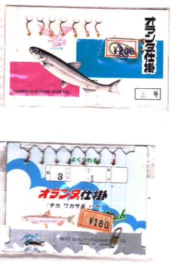 (当時の仕掛けがまだ残っている。使えるかな?) ドボンッと投入すると、小さな魚が寄ってくるのがわかる。 間をおかずして、ビンビンビンッという魚の感触が伝わる。 父の友人の目論見どおり、たくさんの魚が簡単に釣れ、小学生は夢中になって釣るのだった。 ところで、もう一つの釣り方はというと、これもサビキのように針がいっぱいついているのだが、違うところは、針に毛が生えているところと、 カゴの代わりに木製のウキがついているところ。 要するにウキの重みで振り込んで釣る毛ばり釣り。 小学生の僕には釣れなかったが、父の友人は夕方これで爆釣したらしく短時間で50匹以上の魚を保養所に持って帰ってきた。 その夜は、それらの魚を唐揚にして堪能。 小学生の僕は口から出そうになるまで食べて寝た。 おかげで次の日の朝しっかり乗り物酔いをして、父の友人の車の中に半消化物をぶちまけたのだった・・・。 それ以降、再びその人に釣りに連れて行ってもらった記憶はない。 |