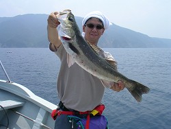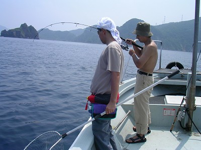 先月のシーバスジギングでは、柿之介一人なぜかあまり釣れなかった。 キャリアの違いか、道具の違いか、腕か、運か・・・。 ということで、リベンジを誓って再度同じ釣りにでかけた。 今回はハセやんが仕事の都合で不参加。 かわりにモッちゃんが参加する。 夜中11時、柿之介宅出発。 3時間ほどかけて現地到着し、1時間ほど仮眠すると出船の時間になった。 さあ!ポイントへ! というところだが、三人とも無言である。 実は眠いのだ。 みんな仕事が終わったあとほとんど寝ずに来たので、強烈な睡魔に襲われている。 それでも、魚が釣れ出せば眠気なんか吹っ飛んでしまうだろうと思っていると、 これがまた釣れない。 しかも、根がかりが多くジグがどんどん無くなる。 船長も気を使っていろいろポイントを変えてくれるが、 なかなかいいポイントにあたらない。 魚はいる(魚探には映っている)のだが、食わないらしい。 実際、ジグを追って魚が水面近くまでくるのを何度もみた。 そのうち、日が高くなり、暑さが尋常ではなくなってきた。 汗がボトボト落ちるので、それをゴシゴシ拭いていたら日やけ止めがとれて、後でえらいことになった。 寝不足と猛暑に耐えながらもあきらめずジグをしゃくっていると、柿之介に待望のヒット! あがってきたのはフッコクラスだったが、嬉しかった。 でも水面でバシャッと跳ねて、逃げていったのは悲しかった。 その後、船長のこまめなポイント替えのおかげか、ポツポツと釣れるようになってきた。 モッちゃんは50センチほどのヒラマサを釣ったし、ヤスは80センチ弱のシーバスを釣った。 ![]()