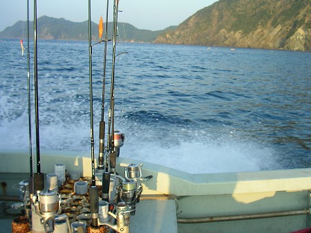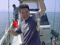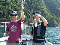 日本海オフショアエギング 2004年9月12日 晴れ、ただし強風! ![]() 初挑戦で小さいながらも5ハイのイカを釣り、イカレベルも2に達した柿之介であるが、 その後、なかなかイカ釣りに行く機会に恵まれず、すでに1年が経とうとしていた。 9月5日に明石の小さな港で偵察をかねて竿をだしてみたが、時間もあまりなく、 ホタルイカより少し大きいくらいのサイズが1匹釣れただけで終わってしまった(それでも釣れたから嬉しかったけど)。 そして翌週の9月12日。 初めはヤスとズガニ捕りの計画を立てていたが、日本海のよく利用している船が空いているということだったので、イカとツバス狙いに急遽変更。 ハセやんも加わって3人でオフショアエギングということになった。 出船は午後からだったので、柿之介の家を朝7時過ぎに出発し、 現地に到着したのが11時ごろ。 タックルの用意をしながら船おやじに様子を聞いていると、 「ジギングはあかんけど、イカは釣れとる」とのこと。 なんと珍しい!現地でいい情報を聞くなんて! 釣りなんて大体が、 「昨日はよう釣れとったんやがなぁ」とか、 「あと10日ほどしたらよくなるんやけど・・・」 とかばっかりで、 「はい。まさしく今、よく釣れています」 なんてことは聞いたことがない。 しかし今日は、「イカはよく釣れている」という。 「ほんまかなぁ〜」といいながら、顔が笑ってしまう。 ところが、出船時間になると笑ってた顔が引きつりはじめた。 すごい風がびゅんびゅん吹いている。 やばい・・・今日は釣りどころではないかも・・・。 でも最近ちょっとだけ、船にも強くなってきたし、 もちろん酔い止めの薬も飲んだし、 午後出船なんで、睡眠不足でもないし・・・。 と考えているうちにポイントに到着。 やはり風がきつくて船がすぐ流される。 が、不思議と波はあまりない。 これならいけるかも! すると、いきなりハセやんがイカゲット! 手のひらサイズなので本人は不満げだが こちらとしてはうらやましい限り。 だいたい今の時期は新子とよばれる今年生まれたイカが釣れるので あまり大きくはないらしい。 続いて、ヤスもイカゲット! 小ぶりだが、こちらは嬉しそう。 こうなると少々焦ってくる。 どんな釣りでも自分だけ釣れないのは一番嫌なパターン。 当然一番スカッとするのは自分だけバシバシ釣れたとき(´ー`) どうも風がきつくて僕の使っている小さなエギはあまり沈まないようだ。 ハセやんはちゃんとエギにオモリを巻いていた。 そこで、少し大きめ(といっても3号)のアオリーQをセットし、底まで沈めて・・・・・・・・・・ありゃ、なんか引っぱっとるぞ。 というわけで、柿之介にも釣れました。 ![]()