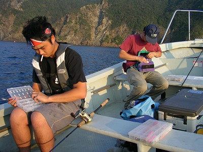 日本海オフショアエギング 2004年9月12日 晴れ、ただし強風! ![]() 「イカは釣れてる」は本当だった! その後もコンスタントにイカが釣れ、個人的にも絶好調! 途中で当たりエギを根がかりでロストしたのは痛かったが、 そのまま夕方まで釣れ続いた。 夕暮れ近くなって最後に少しだけツバスのジギングをすることにした。 ジギングポイントに到着して1投目。 柿之介にヒット〜! これぞツバス!という大きさのツバス(要するに小さい)だったが、やはり嬉しい。 次にハセやんにヒット! フグだった。 しかし、ただのフグではない。 「サバフグ」といって毒の無い(といわれている)フグ。 グルメなハセやんは喜んで持って帰った。 その後、僕が2匹のツバスを追加したが、ハセやんとヤスはサバフグを連発。 フグがラインをかじるのか、ラインブレイクが多発し、日も暮れかかってきたので終了とした。 最終釣果(アオリイカ) ハセやん : 25ハイ 柿之介 : 23ハイ ヤス : 20ハイ 柿之介、ヤスのイカレベルが1上がった!