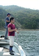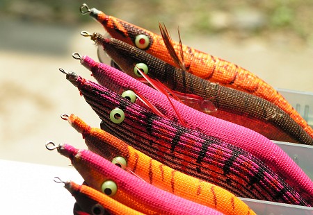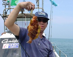 連続ヒットも少し遠のき、昼近くなって人間もイカもダレぎみになってきたとき、ヤスが 「お、今度のはでかい!!」 と控えめに叫んだ。 見ると、ドラグが出て、でかそうである。 どんなイカが釣れたかな、と見ていると、上がってきたのはアコウ。 ヤスは、フックに返しがないので慎重に取り込みながら、ご満悦だった。 結局釣果は、最終的にモッちゃんも20パイ以上釣り、柿之介27ハイ、ヤス31ハイとまたまた大漁だった。 この日は3連休の真ん中とあり、磯や筏も釣り人で賑わっていたが、そちらの方もよく釣れていたらしい。 いや〜、釣れるって本当にいいことですね。
