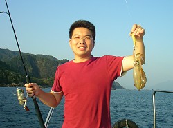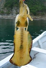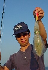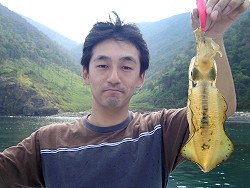 2週連続・・・ 2004年9月19日 曇り時々晴れ ![]() 先週はイカがよく釣れた。 今週は前からヤスが言っている「でーっかい太刀魚」に挑戦か! ヤス 「太刀魚の船、どうも青物に時間とられるみたいで、太刀魚にあんりまり時間割いてくれへんらしいねん。ハマチはまだそんなに大きくないみたいやし。 イカ釣りの経験値稼ぎに、今週もイカ行かへん?」 柿之介 「そうか。まぁ釣れるもんは釣れてるときに釣っといたほうがええからなぁ。 そしたらイカにしょうか!」 ということで、2週連続イカ釣りということになった。 今回は隠岐に旅立ったハセやんと入れ替わりにモッちゃんが参加。 モッちゃんのイカ実績はこのときの1パイだけとのことだが、 今日は釣れるぞ、きっと。 夜中の2時、柿之介宅出発。 飲み会明けで参加したモッちゃんは後部座席で寝ている。 途中、山道でまとまった量の雨が降り出したがこれは予想通り。 前日調べた天気予報では、今日の降水確率70%ということだったので、 あわててカッパ(7000円でした^^)を買いに行き、アオリーQ3号も買い足しておいた。 ところが、いざ現地について出船時刻になってみると、秋晴れ・・とまではいかないまでも青空が見えていて、 結局、釣り中、雨は一時パラパラっと降っただけでカッパは全く必要なかった。 さあ、出船! 比較的浅いところで先週よかったところを攻めると、柿之介の第一投目からヒット! ヤスも一投目でヒット! モッちゃんは・・・まぁボチボチ行きましょう。 型は先週より一週間分大きくなった感じで、コロッケ〜ハンバーグ、トンカツサイズ。 活性は少し落ちているのか、スレて来ているのか、先週より底のほうで当たることが多かった。