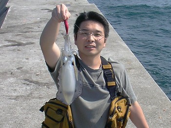 上がってきたのは、胴長が20センチを超えた立派なイカでした。 いや〜、嬉しい! 足場が高かったのでよっこらしょという感じで上げたが、もし触腕だけだったらきっとばらしていたと思う。 上げると同時に必殺の一撃を食らったが、まぁ釣れたからよしとしよう。 しかし・・・隣にいた同行者も(僕よりひどく)必殺の一撃を食らってしまった。 白っぽいシャツとズボンだったので墨が目立つ。 「これ昨日買ったのに〜」とお怒りだった・・・。 どうもすいません。 その後は当然2匹目のどじょうを狙ったのだが、全くあたりもなく、姿も見えなかった。 〜岩屋の漁港〜 アングラーズで情報を聞いたら島の南端と北端を教えてくれたので、帰り道に近い北端(岩屋)の漁港に行ってみた。 途中、昼ごはんを食べたからか、着く頃には強烈な睡魔に襲われたので、 帰りの運転も考えて僕は仮眠をとり、同行者は一人海へと向かった。 夕方近くに僕が目を覚ました時、同行者はかなり離れたところまで歩いて行っていた。 車でそちらに向かい、合流したが、どうもその場所(漁港)は家族連れが多く、あまり期待できそうにない。 おまけに一日中吹いていた風がさらに強くなり、エギが沈まない。 オモリをつけてやったりもしたが、どうにも釣りにくいので日暮れ前ではあったが納竿とした。 帰りは渋滞に巻き込まれたため多少時間がかかったが、今回淡路島というところが釣り環境のかなり良いところだということが分かったので、 今後は訪れる機会が増えるかもしれない。 ただ、やはり道路と橋の通行料が高いので、できるだけ事前に確実な情報を入手して効率のよい釣りをしないと、もったいないかなぁ。 |
