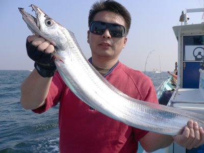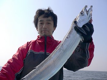 やりました!指6本! キングの称号は指8本かららしいので、キングタチウオとはいわないが、 満足できる大物に間違いはない。 顔つきも下顎がしゃくれてて獰猛そのもの。 迫力ありますなぁ。 その後、タチウオがバンバン釣れ続け・・・とはならず、 シビアな状況のまま、午後2時前に終了となった。 結果 モッちゃん7匹(最高指5本) ヤス 4匹(最高指4本) 柿之介 3匹(最高指6本) 前半の青物狙いをすべてタチウオにしてくれればもっと楽しめたと思うのだが、青物の方がいいという人が多いんだろうか。 この日は同船の他の人が、58センチの巨大アコウと50センチ級のマダイを釣り上げ、船長もびっくりしていた。 また、タチウオの最大は指7本クラスだった。 いや〜、やっぱり船に乗ると大きな魚が釣れますねぇ。 この日の後半、すこしウネリが出てきて気持ち悪くなったので写真もろくに撮れなかったが、 今後はオフショアの釣行が増えそうな予感 ^^;