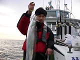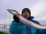 ヤスのヒラメを見て、僕も少々底たたきをしてみたが、あまり感覚もつかめないので再び真面目にタチウオを狙うことにした。(この頃、周りでは根がかりしている人が多かったような気がする^^; ) しかし、真面目に狙ったとて、ホイホイ釣れるものでもなく、だんだんにアタリも遠のき、ついに船長の「それじゃぁ、上がりましょうか!」の声でタイムアップとなった。 結局、最終釣果は、 ハセやん:10匹 柿之介:8匹 ヤス:5匹 + でかヒラメ だった。 数ではハセやん、型はヤス(ハセやん?)、高級外道賞もヤス、ということで、僕としては影の薄い結果となってしまったが、型は小さくないし8匹も釣れたし、釣果としては満足ですな。 それでも船長は数日前、お客さん2人がタチウオ60匹を釣り上げたらしく、それに比べると「今日は渋かったなぁ」と言っていた。 1人30匹とはすごいなぁ。 しかし、200グラム前後のジグで100メートルの深さを探り、30匹釣るとなると・・・ 僕の体力では無理かもしれんねぇ。 なんせ、今回でも軽く筋肉痛なんやから。