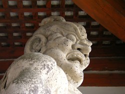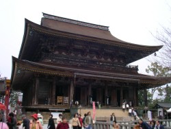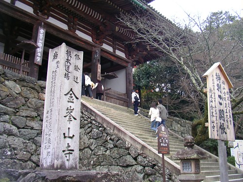 金峯山とは、吉野山から山上ヶ岳(大峰山)にかけての一帯をさす。 この辺りは先ごろ世界遺産に指定されたことで注目を浴びているが、それ以前から修験道の総本山、あるいは桜の名所として有名だった。 大峰山は女人禁制問題(女性差別とか)や山頂で「親孝行するか〜」などといいながら突き落とす真似をするやつ(?)で知られているが、今回僕が行ったのは、ただの花見なのでその辺りのことについてはまた今度。 それで、2005年4月2日に行ったのだが、見事に桜が咲いていなかった! どうも一週間早かったみたい・・・。 まぁ、お酒飲んで鍋食べて、それだけでも満足やけどねぇ。天気も良かったし。 一応お寺なんかを紹介しておくと、露店と土産物屋立ち並ぶ道をよちよち歩いて行ったところに金峯山寺というお寺がある。 こここそ、修験道の創始者「役行者」が7世紀後半に開創したとされるお寺で、本堂である蔵王堂には本尊の金剛蔵王権現が安置されている。 普段は秘仏として一般公開していないということであったが、このときはたまたまご開帳とのことでお顔(かなり怖い顔で睨んでおられます)を拝見することができた。 このお堂、柱が変わっていて、杉・檜・松なんかのほかに、ツツジ・梨といった木が使われている。ツツジの柱というのはあまり想像できないかもしれないが、かなりの大木で「これほんまにツツジ??」と驚いてしまう。 毎年桜の季節になると大勢の観光客(花見客)でにぎわう場所だが、お寺や古い歴史に興味のある人は、少し時期をずらして訪れてみるとゆっくりまわれていいかもしれない。 ただし、吉野は日本三大(人工)美林の一つに数えられる「杉」の産地。 花粉症の方はくれぐれも注意されたし。